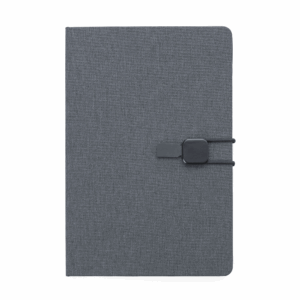Caderno de anotações com elástico, capa dura em tecido poliéster, miolo 80 folhas pautadas na cor bege.