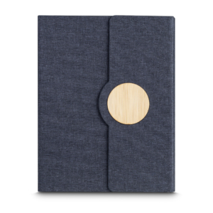 Caderno de anotações, capa em tecido RPET e detalhe em bambú com suporte para caneta na parte interna, miolo com 80 folhas pautadas.