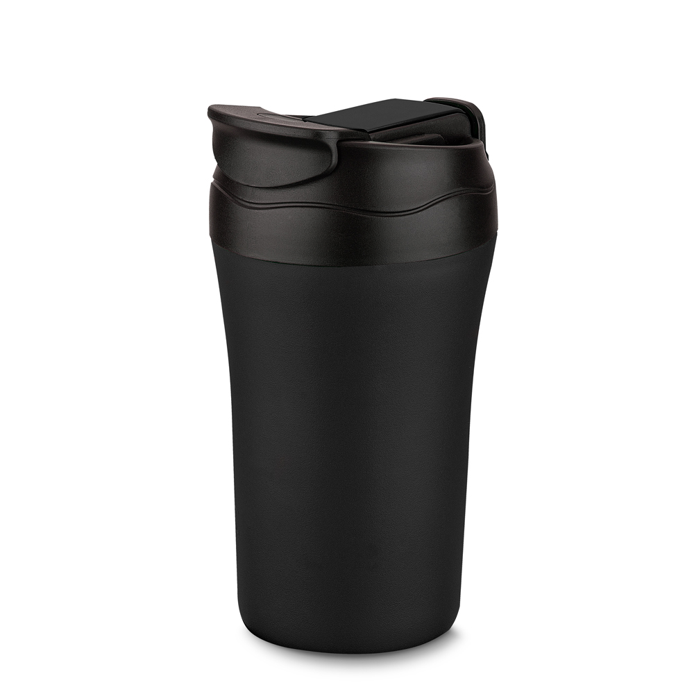 Copo térmico com parede dupla de 500 ml, saída de líquido tanto por sucção (canudo) como por bico, com base revestida de borracha antiderrapante