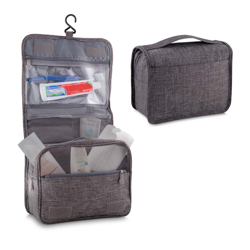 Nécessaire em tecido poliéster 300D e interior em poliéster 190T, com excelente espaço interno, bolso frontal e no verso com suporte para pendurar.