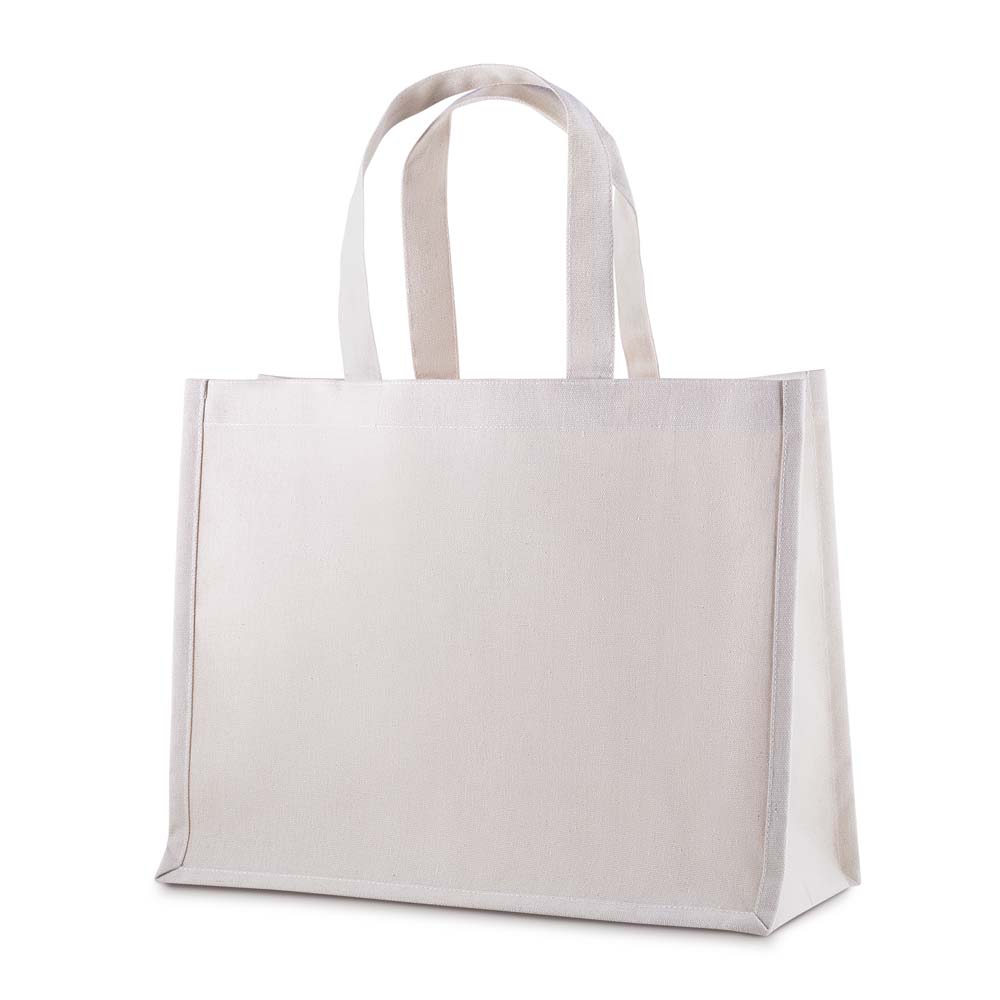 Sacola em Algodão Cru 220g/m², com base plana para maior estabilidade. Alça com altura de 17 cm, ideal para transporte.