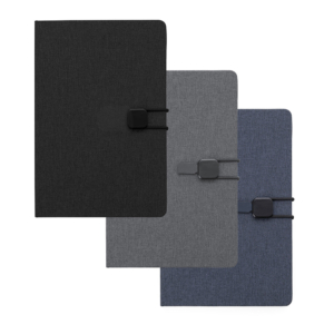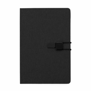 Caderno de anotações com elástico, capa dura em tecido poliéster, miolo 80 folhas pautadas na cor bege.