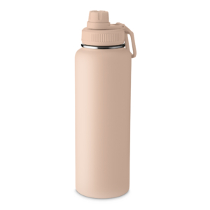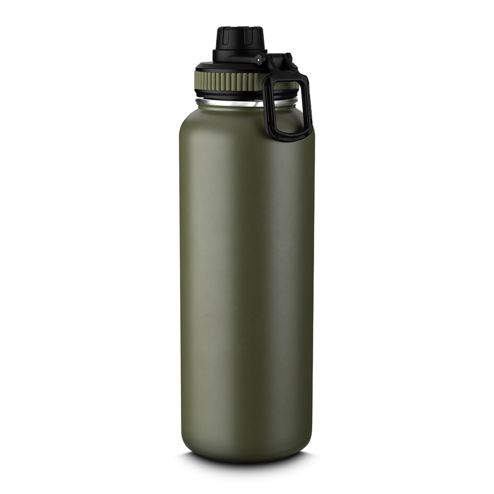 Garrafa térmica em aço inox com parede dupla isolada a vácuo e com capacidade de 1,2l. Alça plástica para transporte em formato de mosquetão, bico rosqueável para fácil acesso e tampa rosqueável com anel de silicone. Conta com uma pintura a pó.