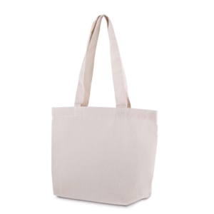 Sacola em Algodão Cru 120g/m²com base plana. Alça com altura de 23 cm, ideal para transporte.